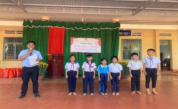 Đồng chí Y Thúc K Đoh – Tổng phụ trách Đội tổ chức hoạt động Xuân yêu thương cho các em học sinh có hoàn cảnh khó khăn.